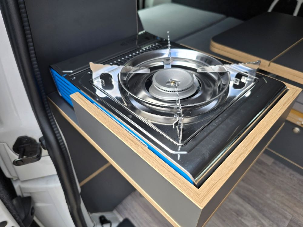 Eingehauster und klappbarer Kartuschenkocher Campinggaz DLX mit Stopgaz. An Oberschrank bereits montiert.