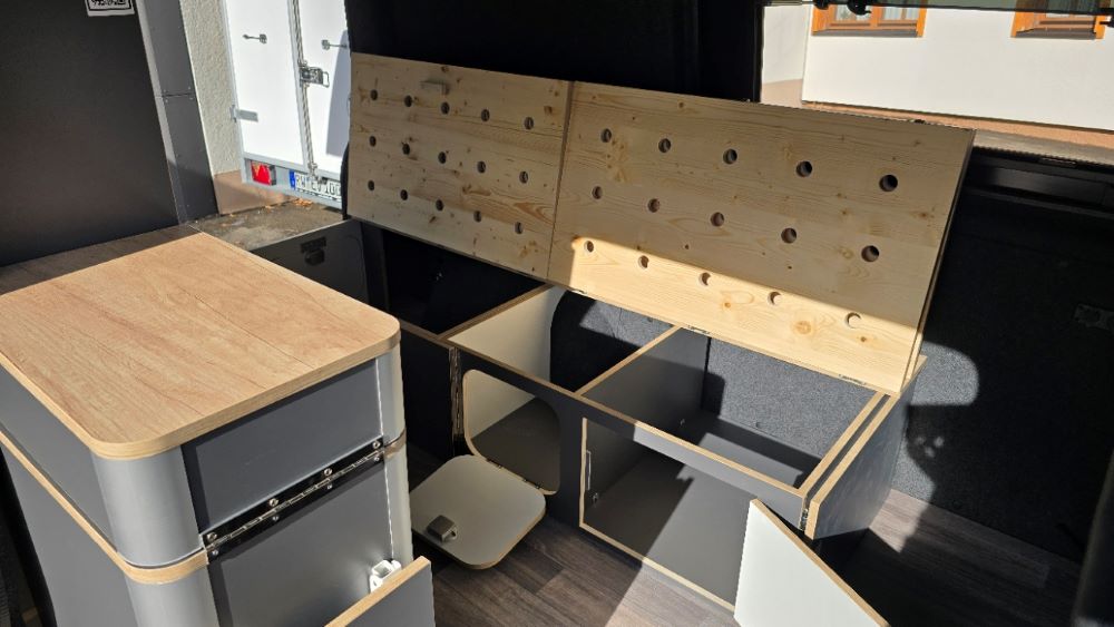 • Bettmodul 2. Stauraumklappe zur Heckklappe/Flügeltüre. Ebenfalls komplett umklappbar und nach oben aufklappbar