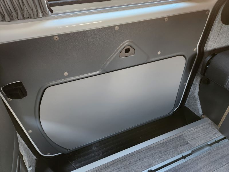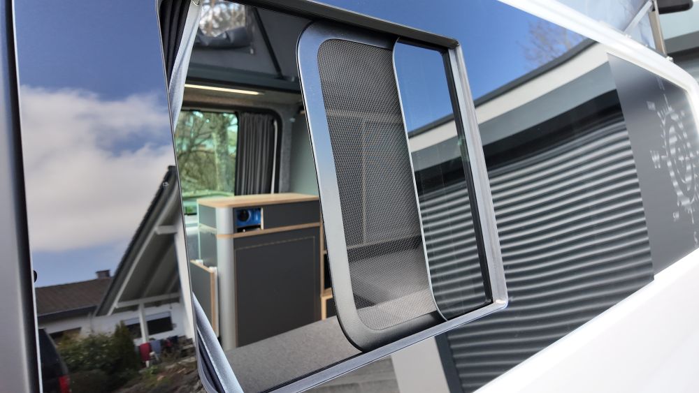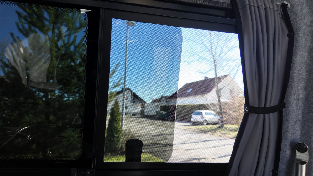 - Zwiegenähte Raffgardine, gute Isolierung, Blickdicht, macht den Bulli wirklich Dunkel hängt nicht Raum. Innen grau, außen schwarz. Preis pro Fenster inkl. Montage.