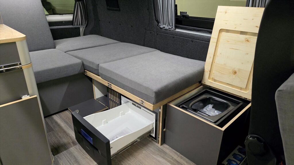 Kühl/Gefrierschublade: Optional für noch mehr Flexibilität im Easyvan for 2(3). Zum Beispiel: Für eine immer zugängliche Trentoilette, Hundebox, Stauraumschrank…oder einfach freien Stauraum zwischen Bettmodul 1 und Fahrersitz. Passend für alle Easyvan Camper, egal ob kurzer oder langer Radstand. Inkl. premium Kühl/Gefrierschublade Vitfrigio D30 A (30 Liter).
