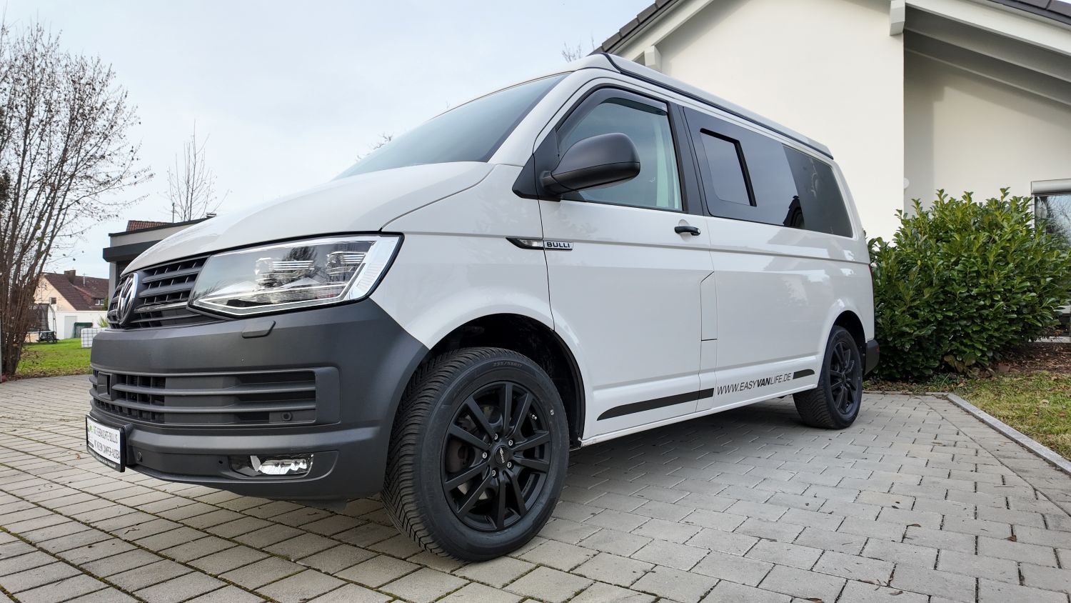 VW T6.1, Langer Radstand, 4 Motion mit Hinterachssperre: Easyvan for 4 mit optionalen Einzelsitzen, Rail In Schienen, 50 Liter Vitfrigio Kühlschrank Element, verschiebbare und Herausnehmbare Schlafsitzbank mit Isofix, nach außen drehbarer Küchenblock, Bettkasten, Reimo Aufstelldach mit Froli Komfortbett, Ablage Dach langer Radstand, Blendfreie Innebeleuchtung mit beleuchtung vor beiden Schiebetüren, 210 AH Lifepo4 Bulltron Batterie mit 50 AH Ladebooster, Buck Boost mit 100 Watt Leistung (Kein Landstrom oder Solar notwendig bei reinen Standzeiten unter 5 Tagen), Luft Standheizung mit Timer, Folierung mit Easyvanlife Kompassrose XL, Twin Monotube Höherlegungs-Gewindefahrwerk Sensitiv (Koni CL Dämpfer), 3,2 Tonnen Zulassung, 235/65 17 Pirelli All Terrain Reifen auf Twin Monotube AT1 Felge in Terra, Multirail links und rechts, Thule Markise….