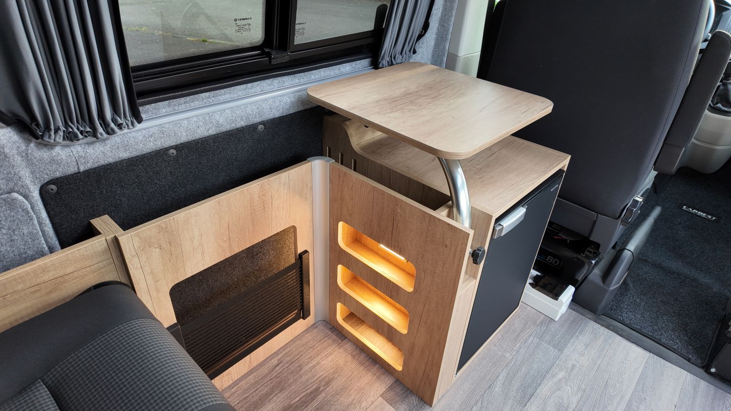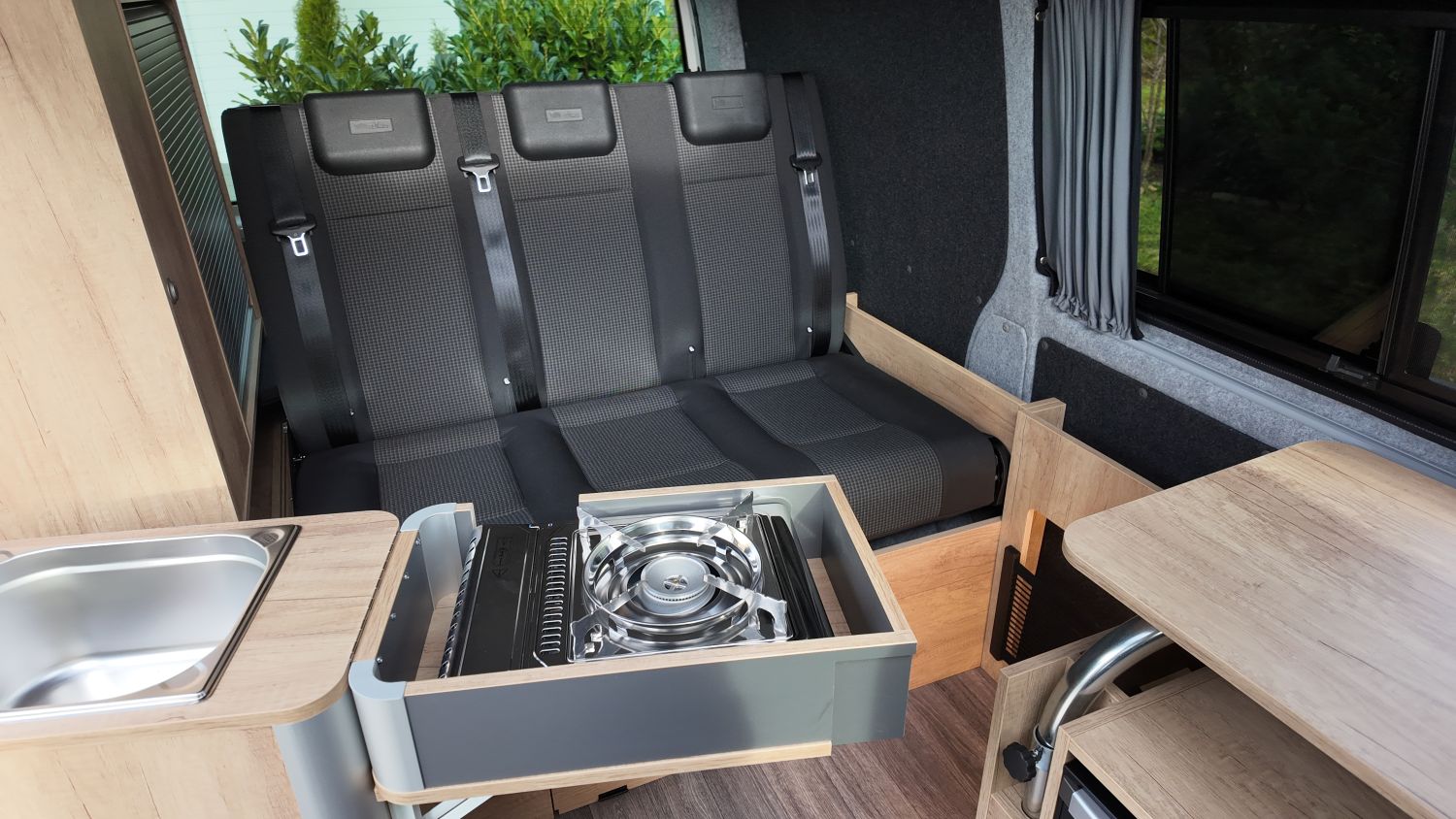 VW T6.1 Neuwagen mit original VW Aufstelldach, Easyvan for 2 Ausbau mit Luftstandheizung, Kompressorkühlbox und Küchenmodul Flex.