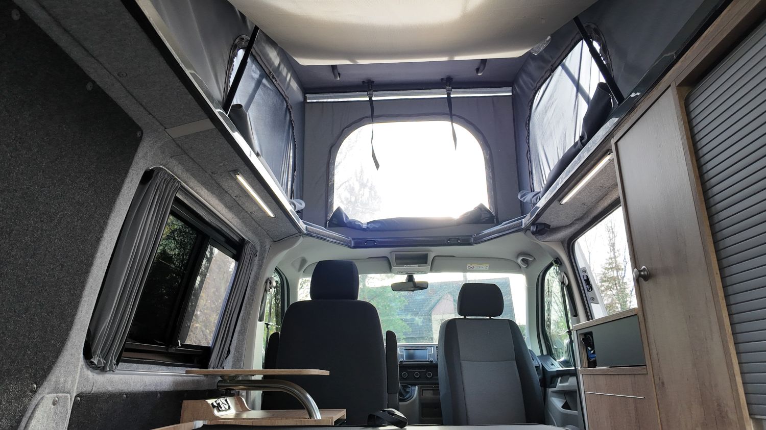 VW T6, 150 PS, 2019: Easyvan for 4, mit Reimo Schlafsitzbank, Kompressor Kühlschrank, Luft Standheizung und Aufstelldach mit Komfortbett