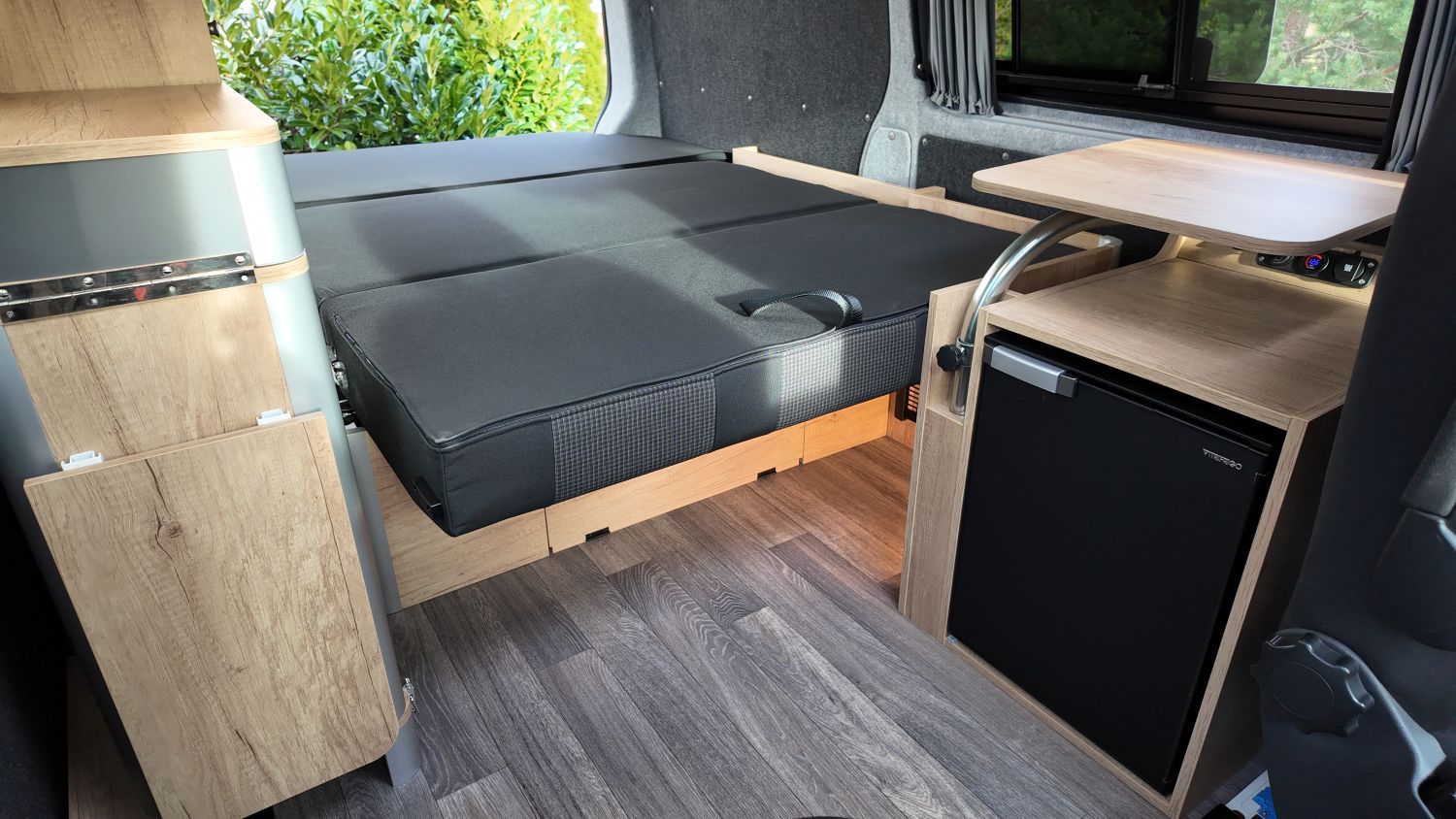 VW T6.1 Kundenfahrzeug: Easyvan for 2 Ausbau mit Küchenmodul Flex und Boden Tessin, 40 Liter Kühlbox, Stromversorgung und Vollfilzung.